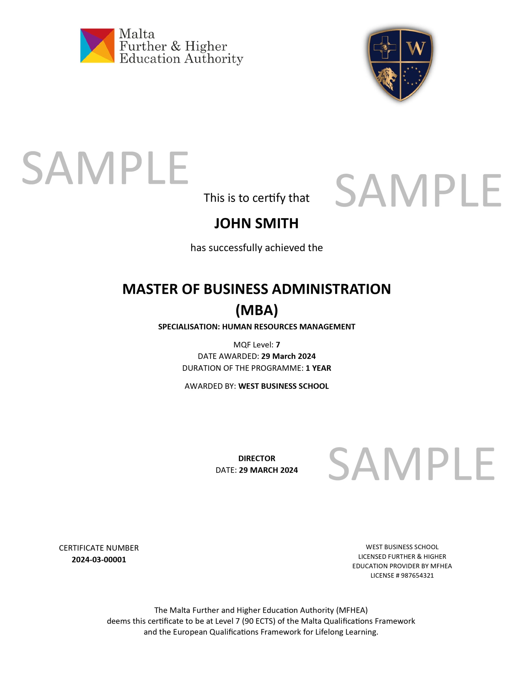 • West Business School is a nationally recognized higher and postgraduate education institution in Malta, licensed and accredited by the Malta Further and Higher Education Authority (MFHEA), Government of Malta. Its qualifications are recognized within the Malta Qualifications Framework (MQF), which is referenced to the European Qualifications Framework (EQF), providing national recognition in Malta and alignment with European qualification standards through the EQF.